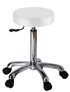 Sgabello regolabile in altezza con pompa a gas. Rivestimento in similpelle lavabile con imbottitura in poliuretano colore bianco.