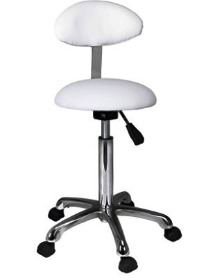 Sgabello con schienale ovale dal design ergonomico ed elegante. Sedile a forma di mezza sfera e regolabile in altezza con un pistone a gas. Rivestimento in PU bianco di alta qualità e stativo cromato con 5 ruote.